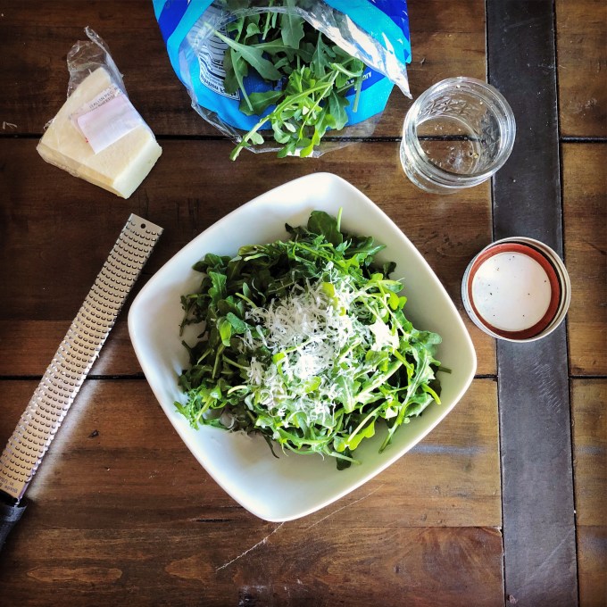 That being said, I am a huge fan of a starter salad. I find starter salads light and interesting and usually healthy. So I made it my goal to eat a starter salad every day-ish prior to eating dinner so that I can get some of those dang greens in. I started with a salad that my sister made for us when she was here over Christmas: arugula, parmesan cheese and dressing. That’s it. And it’s amazing!