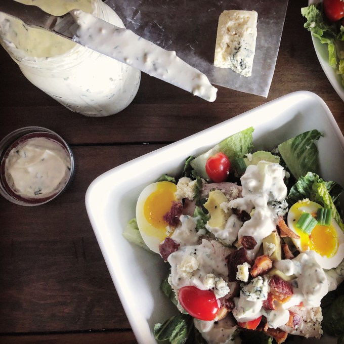 Note that you will want to adjust the portions of the ingredients to your own tastes. If you like tons of bacon, add a whole bunch more. Skip the green onions or chives if you don’t like green stuff. Swap the blue cheese for another cheese or omit the cheese altogether. Make the salad your own for a Cobb-esque salad, if you wish.