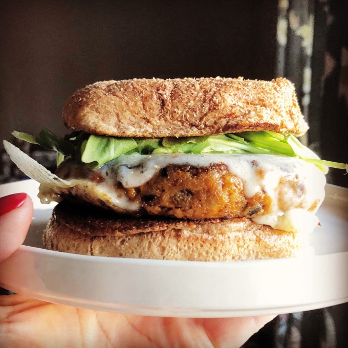 I wasn’t quite sure what to think about these burgers when I took my first bite but they grew on me as I ate my way through the patty. I wasn’t expecting such an overly sweet taste which is kind of funny since the base is at least half sweet potato. What I loved about the patty was how hefty or substantial it was. It wasn’t one of those flimsy veggie burgers that falls apart when you bite in – everything held together well. And by the end of the burger, I had dismissed the overly sweet taste and really just kind of dug the burger. If you are a sweet potato lover you will love this patty!