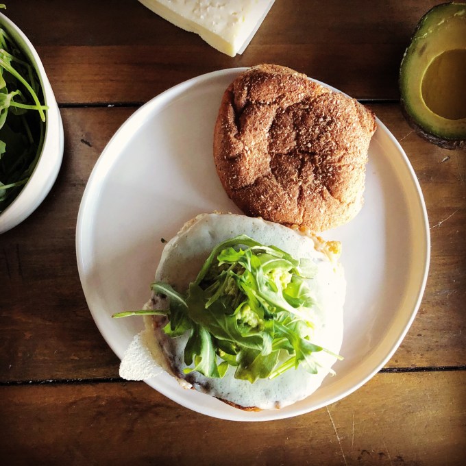 - Serve the burgers on toasted whole wheat rolls spread with mayo. Top with arugula and mashed avocado.