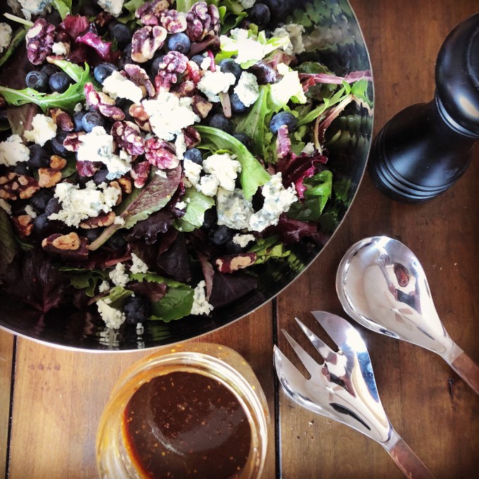 My aunt is in town for her first visit in about 8 or 9 years. She bought a giant tub of mixed greens when we were at Costco the other day, impressively, for $3.79. I happened to have two giant blocks of blue cheese in my fridge (also from Costco) and was on the look out for a salad recipe that would help us chip away at the tub of lettuce and blocks of cheese. I found a recipe to copy at Inspired Taste.