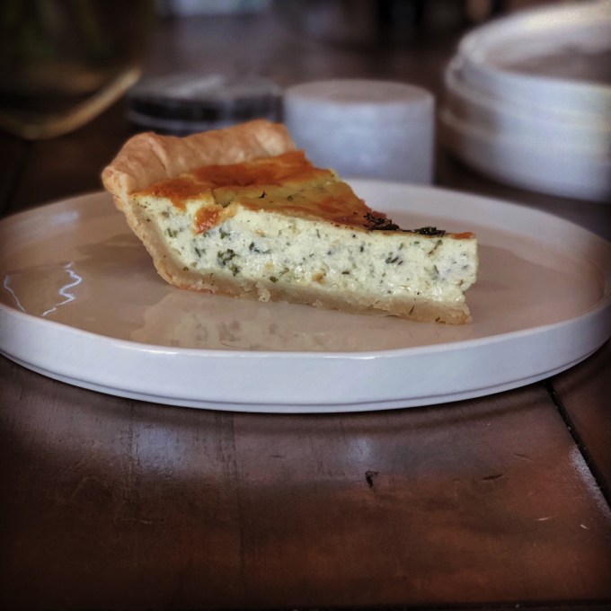 We let this cool about an hour because we started out with a salad, and, I have to say, the temperature was really quite perfect after an hour. Warm but not piping hot. I liked the temperature so much that when reheating the quiche I reheat it only to slightly warm.
