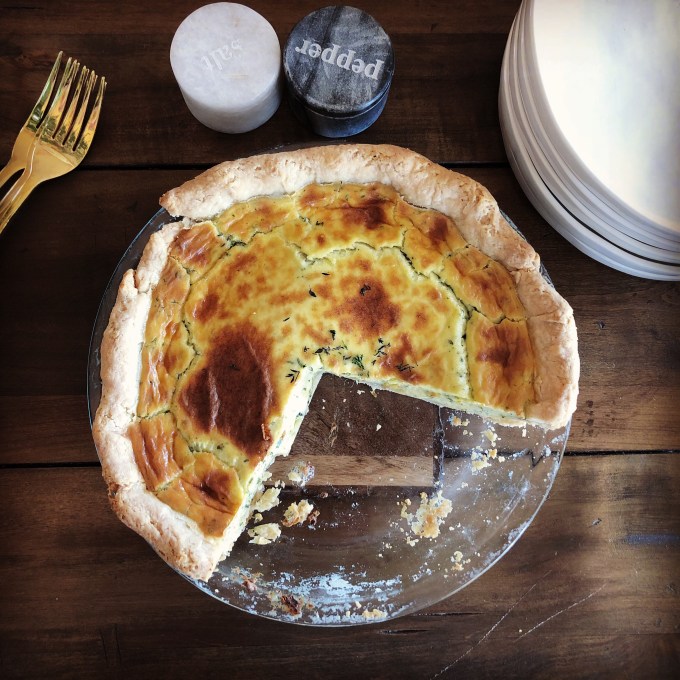 Emeril’s recipe calls to make the dish in a tart pan, which I do not have. If you’re like me and do not have a tart pan, a pie pan works just fine.