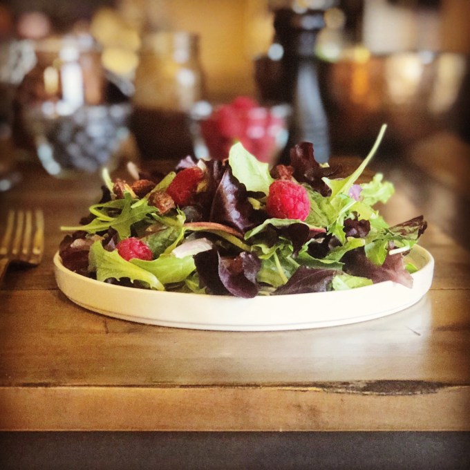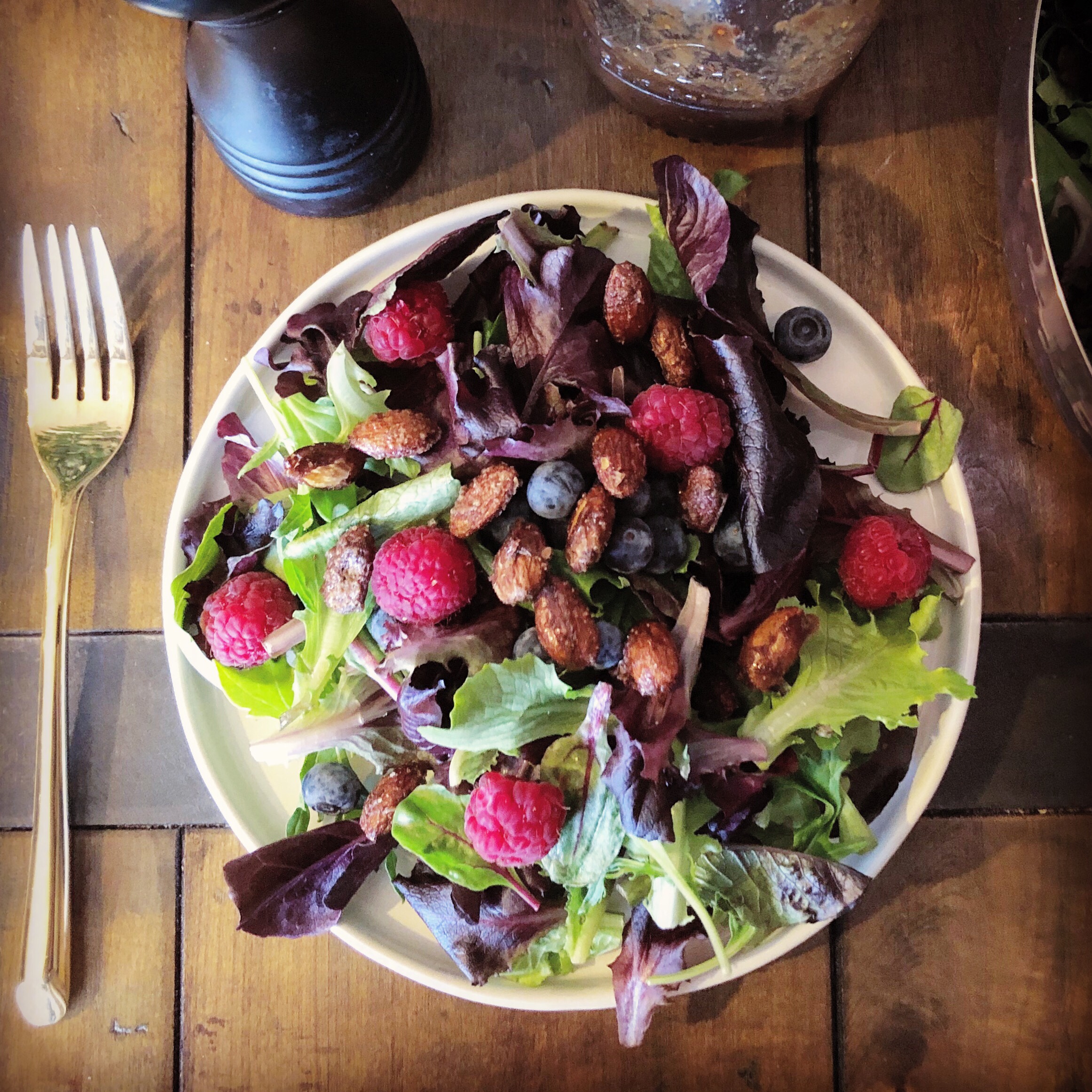 So I found a simple recipe that called for lettuce, berries and candied almonds. It looked like the perfect recipe to use up the rest of the raspberries. So I whipped up some candied almonds and we had ourselves a nice spring-like salad bursting with berries.