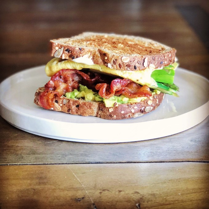 I have no clue exactly what I was looking for when I stumbled upon this recipe for Avocado and Asparagus Omelet Sandwiches at BHG and just dropped what I was doing and stared. I had to have it immediately whether for breakfast, lunch or dinner. I had bread, eggs, and bacon on hand and immediately wanted to run to the grocery store to get asparagus and avocado to complete the dream. I did so the next day planning to make the sandwich in a few days. For breakfast. But then I made my own version of BHG’s sandwich immediately. For the sake of eating a yummy sandwich.