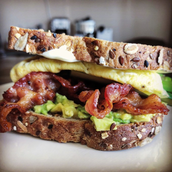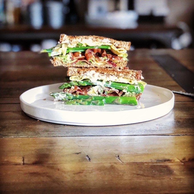 - Meanwhile toast the bread. Spread mashed avocado on 1 of the slices; spread mayonnaise on the other. Top the avocado toast with bacon, asparagus spears, and omelet. Top the bread with the mayonnaise toast. Cut the sandwich in half and serve immediately.