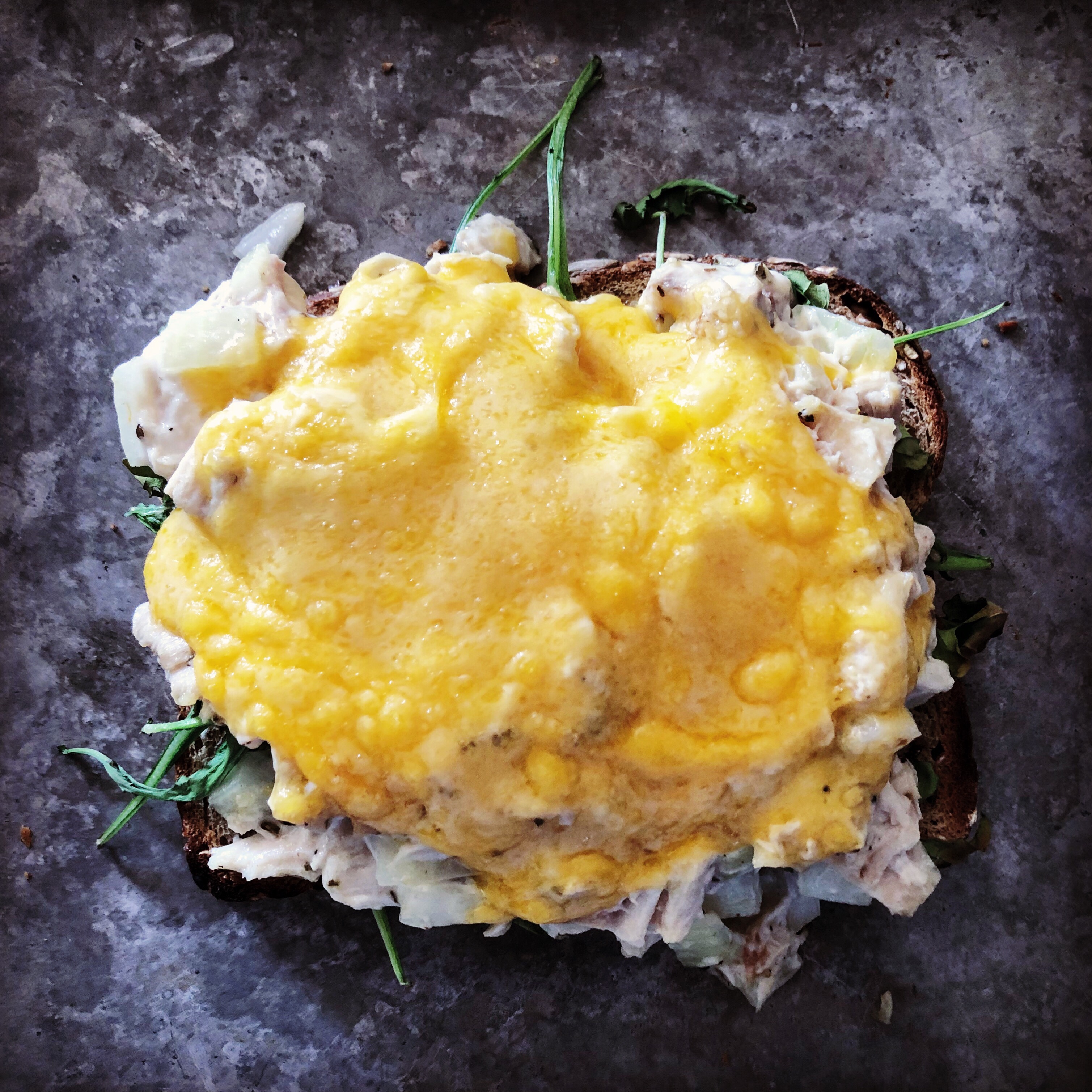 So I took my standard chicken salad and piled it onto a bed of arugula anchored by my standard whole wheat bread. Then I topped the whole thing with a little bit of shredded cheddar cheese, stuck it under the broiler and not long after that… voila. A star was born.