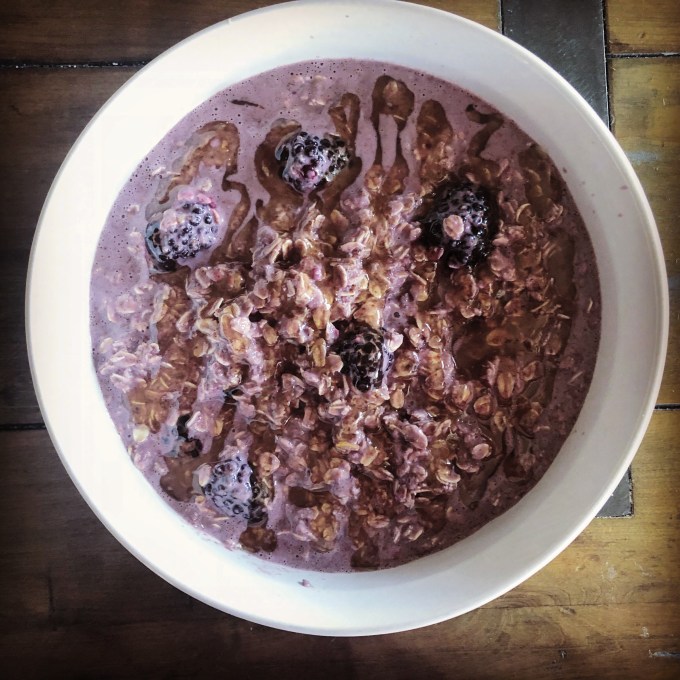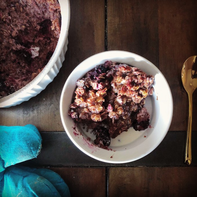 I had no intention of making the recipe again but had this huge smoothie container in the fridge and no idea what to do with it so my friend suggested turning it into an oatmeal bake, something I hadn’t made in a long time. The suggestion seemed pretty good. I have turned food failures around in the past, and when I perused back through some old baked oatmeal recipes and did a bit of measuring of my liquid smoothie I realized I had the exact amount of liquid I would need to replicate a blackberry version of the oatmeal recipe I was viewing. All stars were aligning.