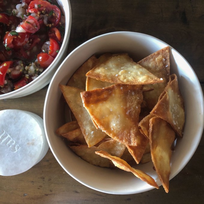 I don’t know that it ever occurred to me to make home made tortilla chips until yesterday when I realized I had this huge bowl of salsa I needed to eat and nothing to eat it with. OK so I did have some beef and pork and tortillas and other fixins’ to make tacos. But honestly the amount of salsa I made was so great that it would have taken me more tacos than I could eat to make my way through all that salsa.