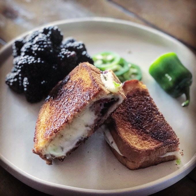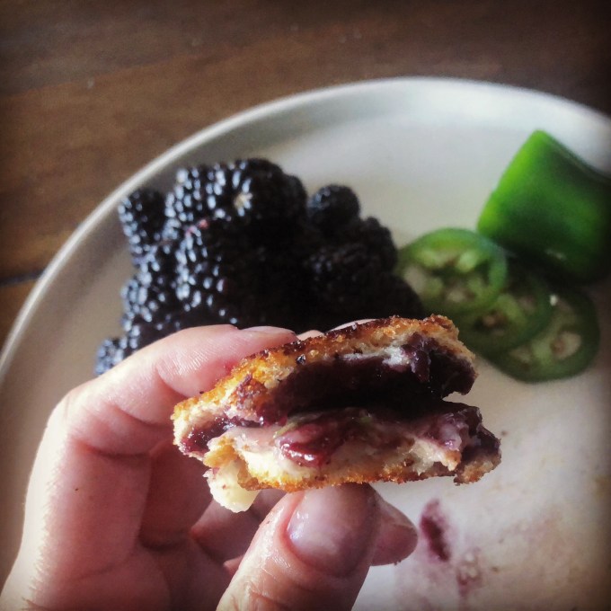 When I first took a bite of this sandwich I was a bit miffed at myself. I could barely taste in blackberry and I thought I had done a decent job of making sure to get blackberry jam spread all the way across the slice of bread. Turns out I hadn’t. As I took subsequent bites and got more into the blackberry, I got happier and happier. You want cheese, jalapeño and blackberry in every bite. It’s a grand combo. I think next time I might make this sandwich with whole black berries that I mash to make a jam leaving some of the blackberries whole. (I’ve done this before to make oatmeal and overnight oats.) I like the idea of bits of blackberry contrasting with pieces of jalepeno melted together with cheese.