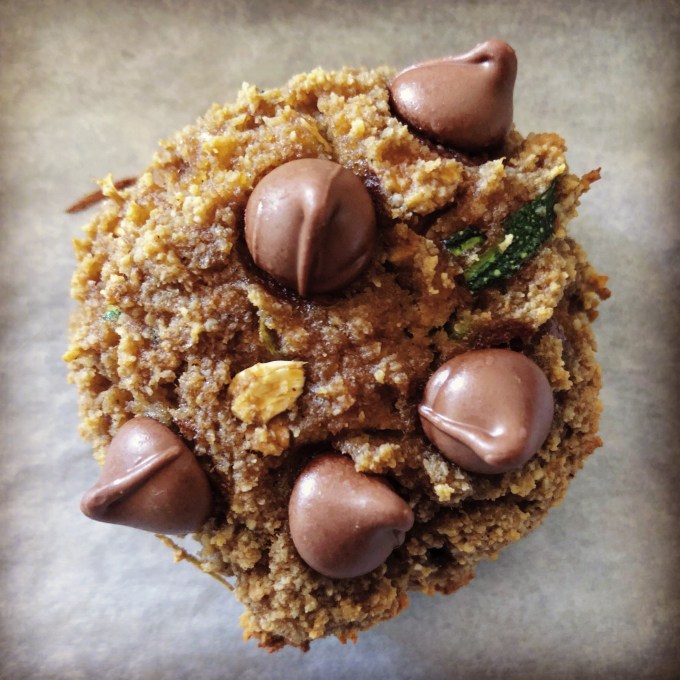 In a large bowl, using a fork, beat the egg and mix with mashed banana until combined. Mix in the yacon syrup, vanilla and coconut oil. Add the baking soda, cinnamon and salt then stir in the flour until just combined. Fold in the zucchini, then the oats and chocolate chips