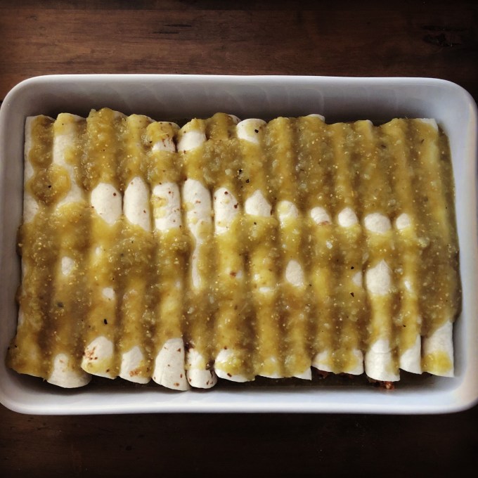 - Meanwhile, pour enough salsa verde into a 9 by 13-inch baking dish to lightly cover the bottom (about 1/3 to 1/2 of the amount called for in the recipe). In a medium mixing bowl, combine all of the remaining filling ingredients.