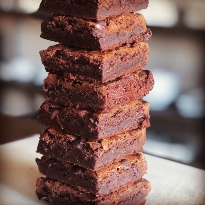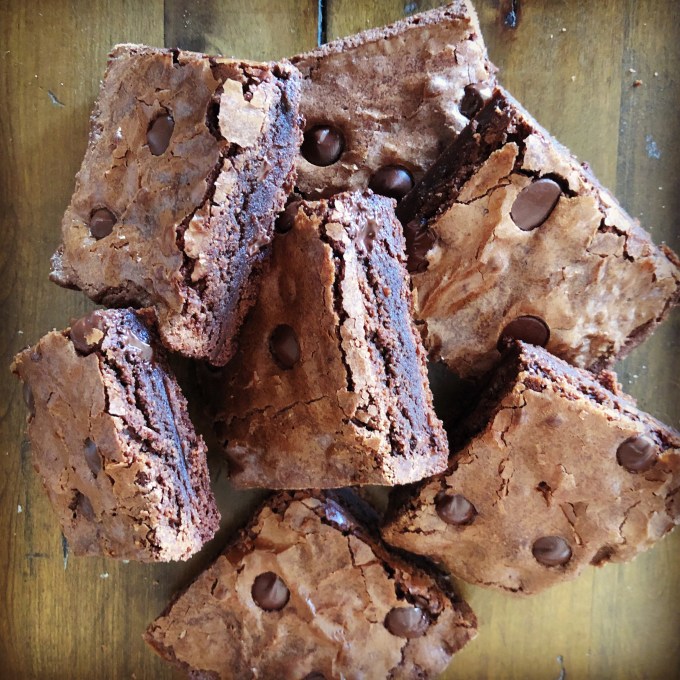 4. Pour into prepared pan and spread into an even layer. Bake for about 35 minutes, until brownies set and a toothpick inserted into the middle of the pan comes out mostly clean (no batter, a few crumbs is OK). Cool in the pan completely before cutting and serving.