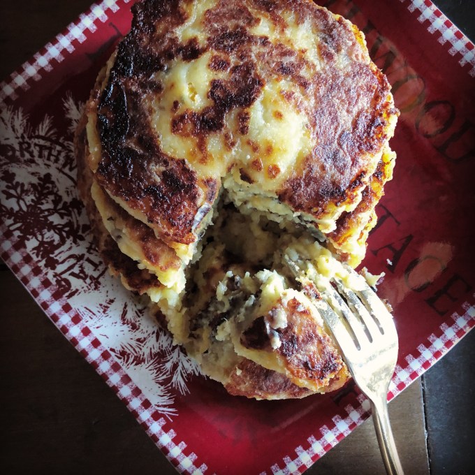 My dad declared that these mashed potato cakes were better than the mashed potatoes I made for Christmas (and I don’t know that he realized I snuck some corn into it!). Eat these as a side or even a meal. I ate them with half of a prime rib and mashed potato panini.