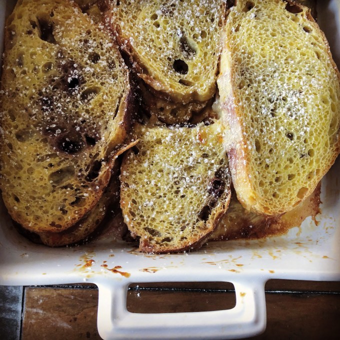 - 16 slices white bread (I used ciabatta bread sliced fairly thin; use something sturdy that won’t fall apart when soaking in the custard)