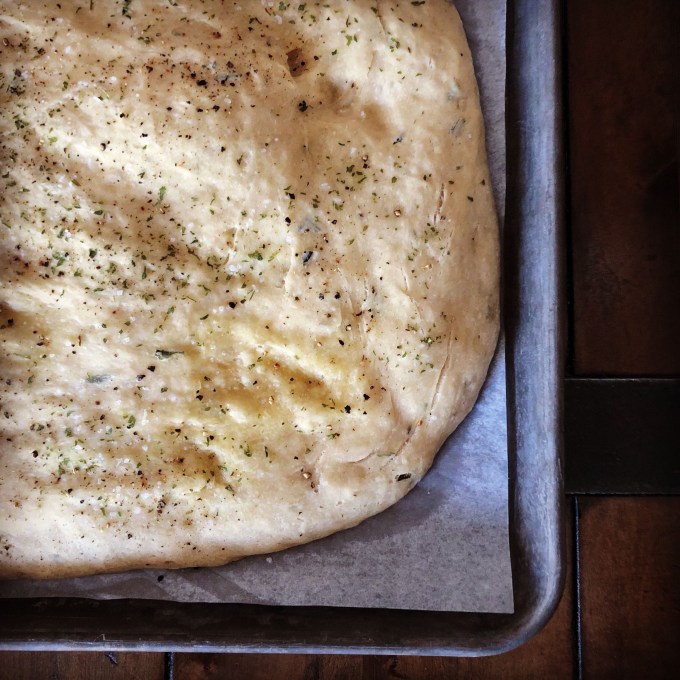 - Sprinkle the foccacia dough with olive oil, salt and pepper and any seasoning you may desire such as thyme, oregano, basil, etc.