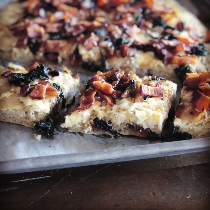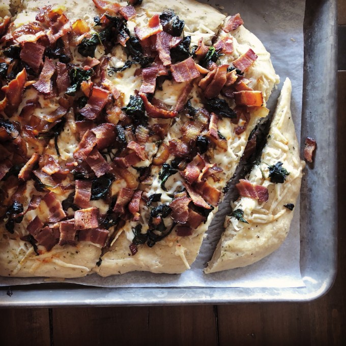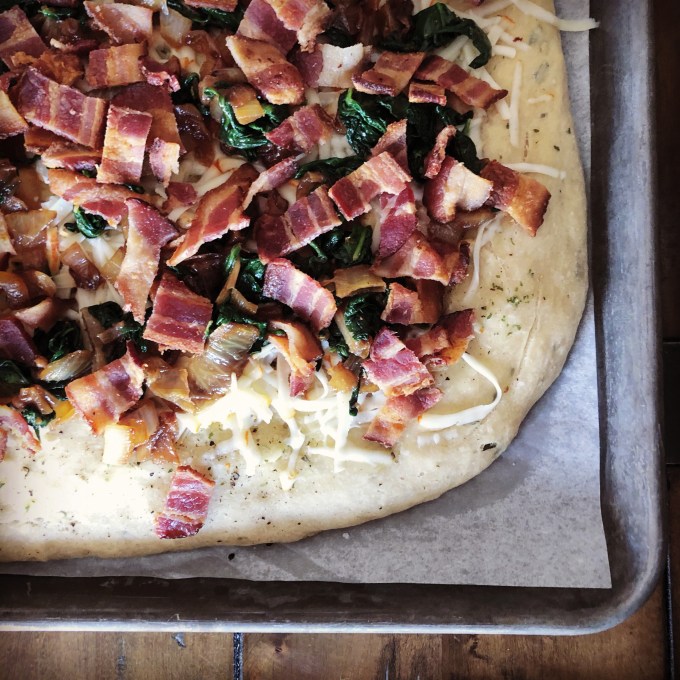 I’m trying to be conservative these days with spending money on food (and in general), which means I’m desperately trying to use ingredients from pantry and fridge. I made a recipe of focaccia bread dough the other day intending to use the dough for something specific that I can no longer recall. But as I was perusing the shelves of my refrigerator I changed course to use up some spinach, an onion and cooked bacon after browsing recipes for spinach + focaccia + pizza.