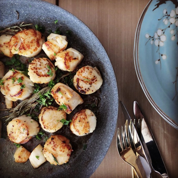 Both Bon Appétit and Epicurious recommend to ask for “dry” scallops which evidently do not have preservatives in them and therefore do not get watery when cooked. I did not do this because you can’t ask such things at Costco and my scallops still browned. I didn’t notice whether they were watery or not between the oil in the pan and the butter added.