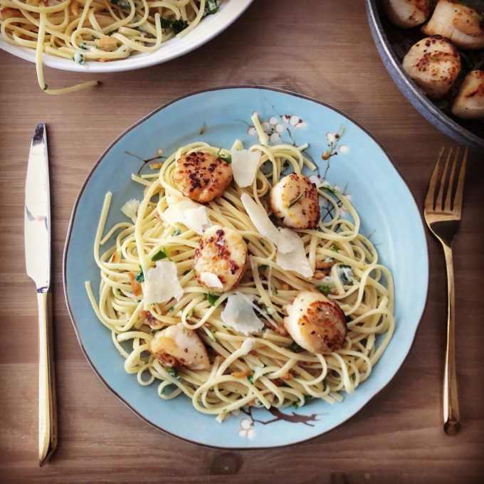 Luckily when you’re buying things at Costco everything is in bulk — even items like scallops — and as someone who often doesn’t feed more than two people I can get some longevity out of most foods. I did with the scallops. First I did a remake of the Bacon-Wrapped Scallops I made a few years ago. To. Die. For. I had to come up with a lip-smacking recipe to use up the other half of the scallops and found one at Epicurious. Which, incidentally, is the same recipe found at Bon Appétit. I thought the scallops would pair well with the Linguine with Brown Butter Parsley and Cheese. I was right. Is there ever such thing as too much brown butter? I think not.