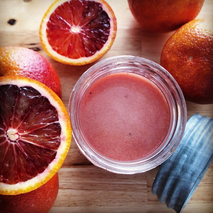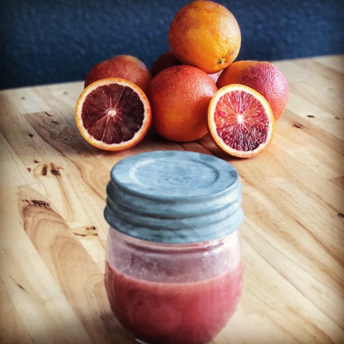 I thought blood orange juice would likely make an excellent fresh and light dressing for a totally fresh large salad chock full of fresh-ish fruits and vegetables. So I found a pretty good looking recipe at Wonky Wonderful that I modified slightly (below). My only regret is that this is such a small portion I really think it’s enough for about two large salads. If I’m being quite honest, I ate most of it for my large salad at dinner but did find salad ingredients swimming in dressing once I dug down to the bottom. If you’re feeding a crowd, you can easily multiply the ingredients appropriately.