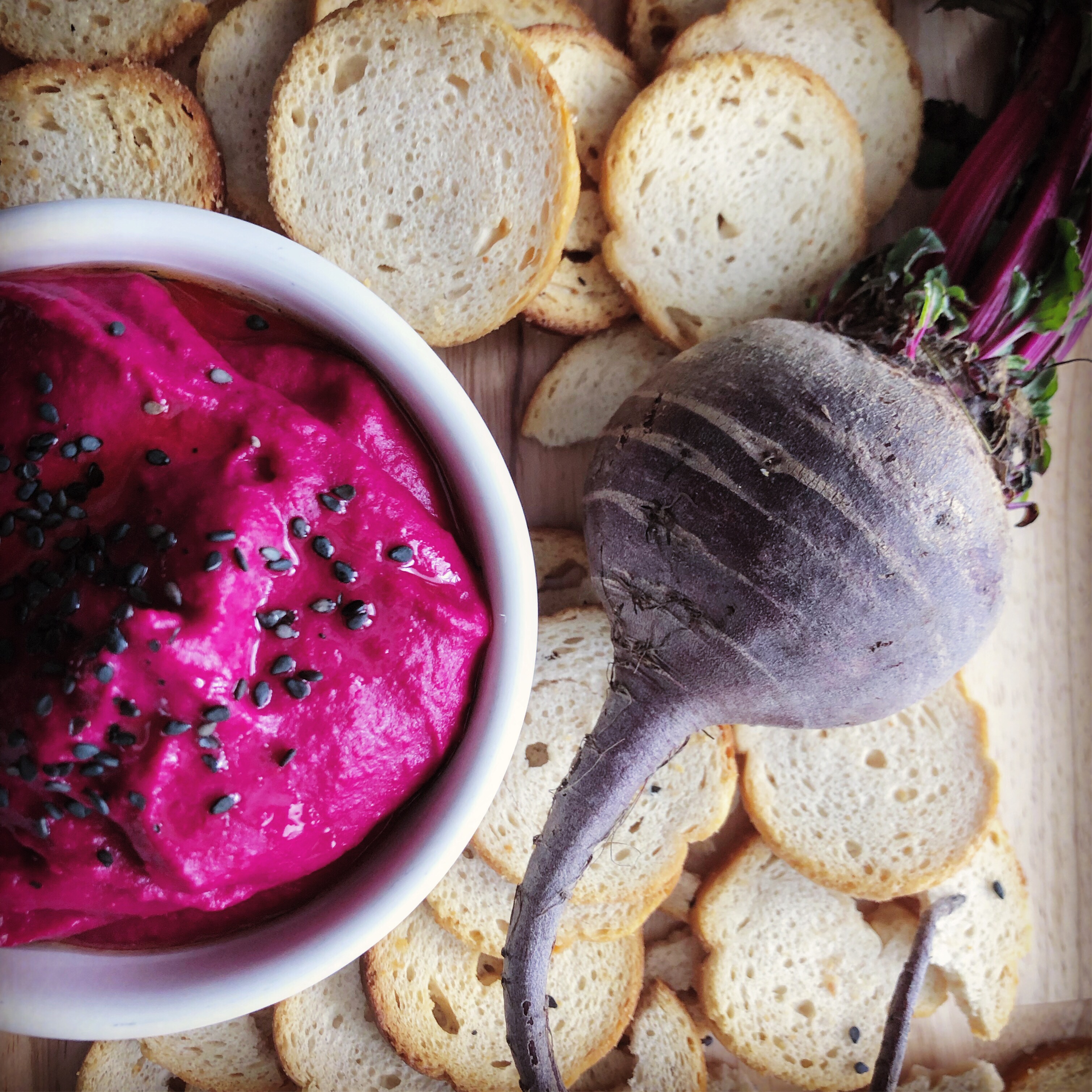 - In a blender or food processor, add the beans, roasted beet, olive oil, garlic lemon juice and lemon zest. Blend until smooth. You may have to add additional olive oil or lemon juice depending on the size of beet you used and the size of your lemon or based on your preference for hummus texture.