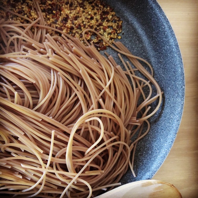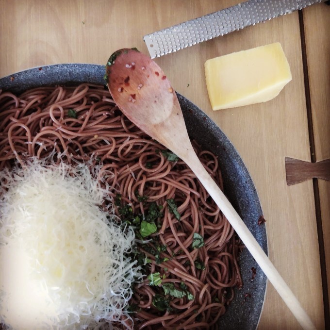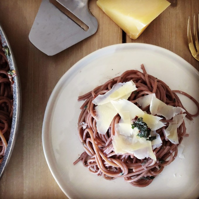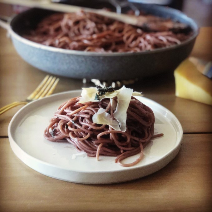 I’ve been seeing lots and lots of red wine spaghetti recipes popping up everywhere which, if you’re a red wine lover, is a dream. Since I’m not, I approached the idea of red wine spaghetti trepidatiously. I mean let’s be honest. I do not care for red wine in the least really hate red wine so why would I like red wine + noodles? Still the idea intrigued me. I’ve seen very simple recipes that are essentially just noodles cooked in red wine. Snooze-fest. But amongst all of those toad of a red wine spaghetti recipes I found a prince: a recipe for a creamy red wine spaghetti from eatwell101.