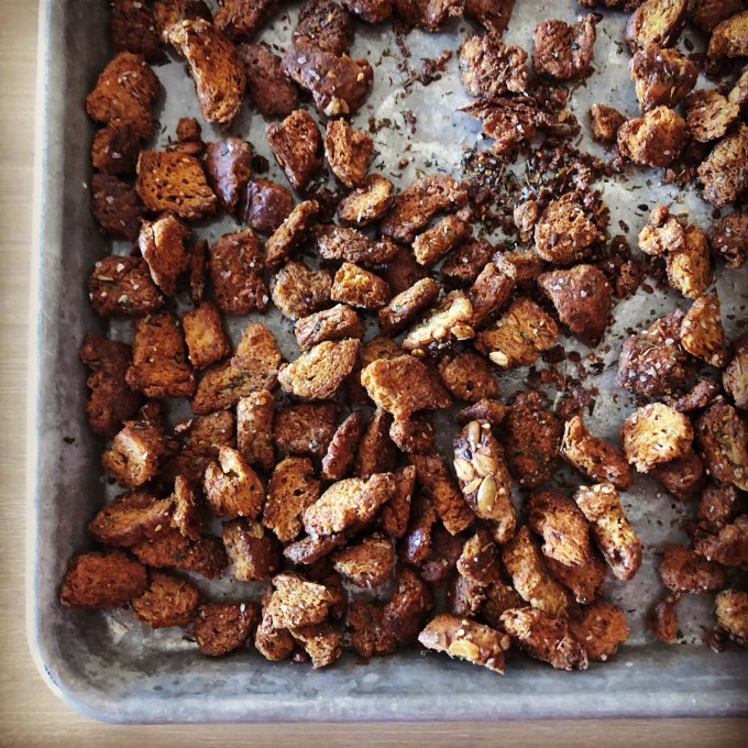 I’ve been having a renewed love affair with homemade croutons recently due in part to the copious amount of salad I’ve been eating and in other part to my need to update pictures on my blog. I believe the latter inspired the former.
