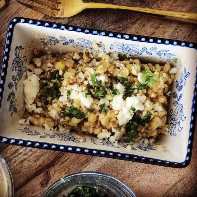 - To make esquites (“corn salad”): Once the corn has been cooked remove the kernels from the cob. (If you’re using leftover corn, pan-fry in a bit of avocado oil and some salt while you are mixing together the “dressing.”) Mix together the dressing: mayo, sour cream, pepper sauce, lime juice, garlic and chili powder. In a serving dish, blend the dressing with the corn. Top with cilantro and cotija cheese.