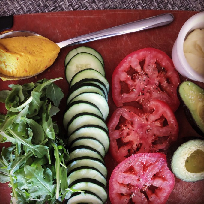 Though I do enjoy many varieties of veggie burgers, a warm veggie burger just sounds more appealing than a cold veggie sandwich. I don’t know why. I like cold salads. In fact I like cold salads more so than warm salads so, by that logic, you would think that a cold veggie sandwich would sound way more appealing than a warm veggie burger, right? Even still, my skepticism was high. But since I’m willing to try just about anything once and I had all the fixins’ on hand to make a cold veggie sandwich, I thought I would give it a whirl.