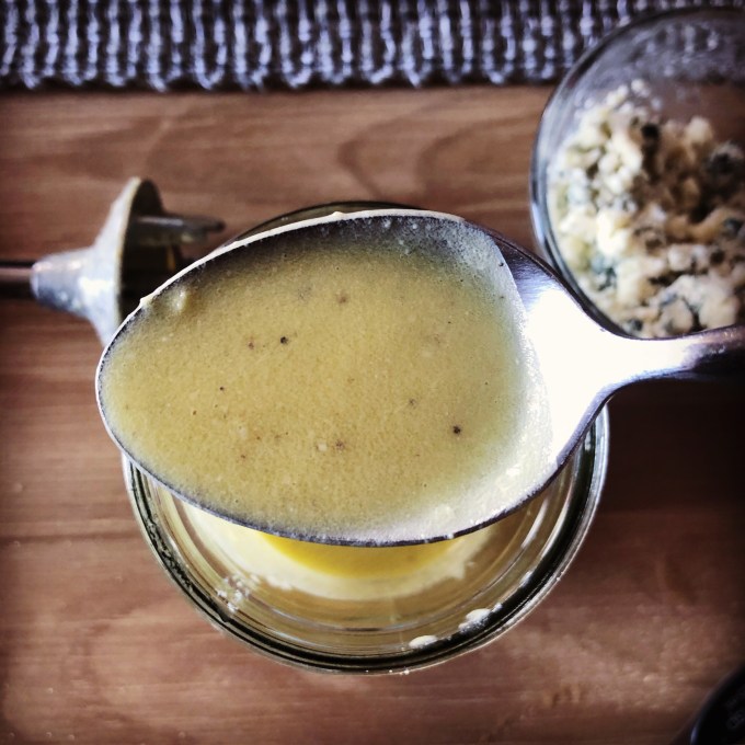 The first try turned out OK. Not very evenly distributed. The blue cheese sort of got stuck in the bottom of the jar. And it wasn’t really as vinaigrette-y as I had imagined. If that makes sense. It wasn’t exactly what I had envisioned for my dressing but because I love blue cheese dressing so much I made the decision that I was not going to waste this dressing. Instead, I blended all the ingredients together using an immersion blender (a technique I had read about while researching blue cheese vinaigrette recipes) to achieve a healthy and creamy vinaigrette dressing. Now I’m hooked and keep a jar of this stuff in my fridge at all times.
