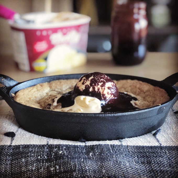 My preference is to undercook these slightly so I cooked them for about 17 minutes. They definitely could have baked longer but were perfect as is IMO. If you’re like me and you never tried making your own Pizookie (and perhaps only ever had one at BJs), you should try this recipe. It’s so simple to make, so delicious and comforting and so beautiful on top of everything else. If you don’t have individual cast iron skillets you can use a 9 or 10-inch skillet. No cast iron at all? No problem. Use a pie pan or cake pan.