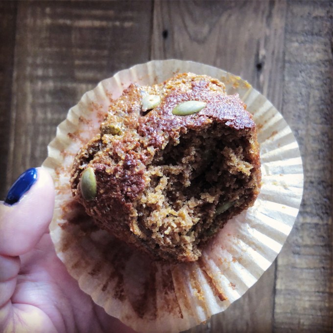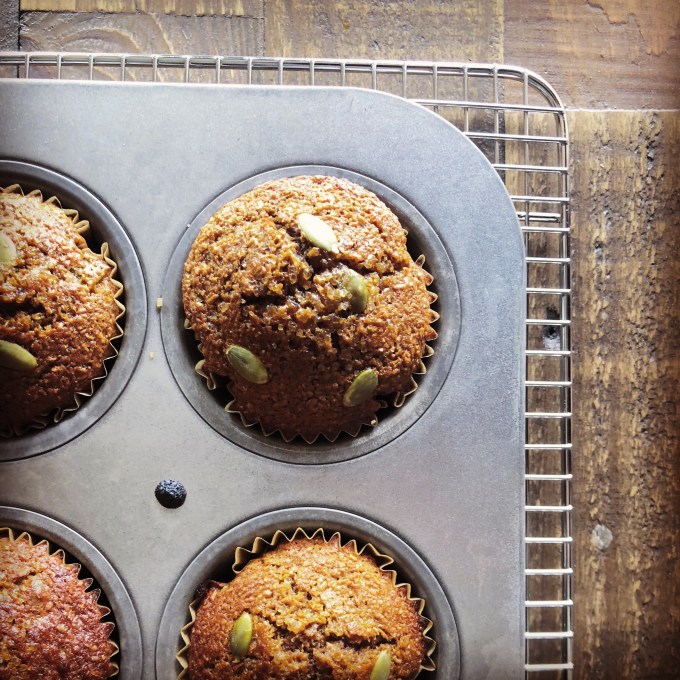 On my third go-round I do believe I nailed it. I made sure not to overcook the muffins and added a bit of brown sugar to the coconut sugar. I also added to the batter mixed chopped dates, golden raisins and pumpkin seeds. You fill these muffins all the way to the top of the muffin tin and they form a nice little peak that pokes up during the baking process. I love this because I hate flat muffins.
