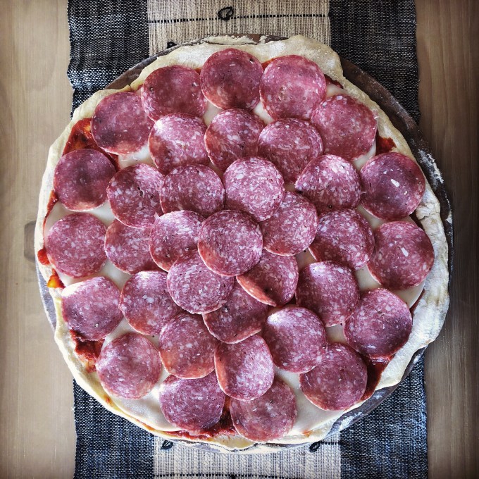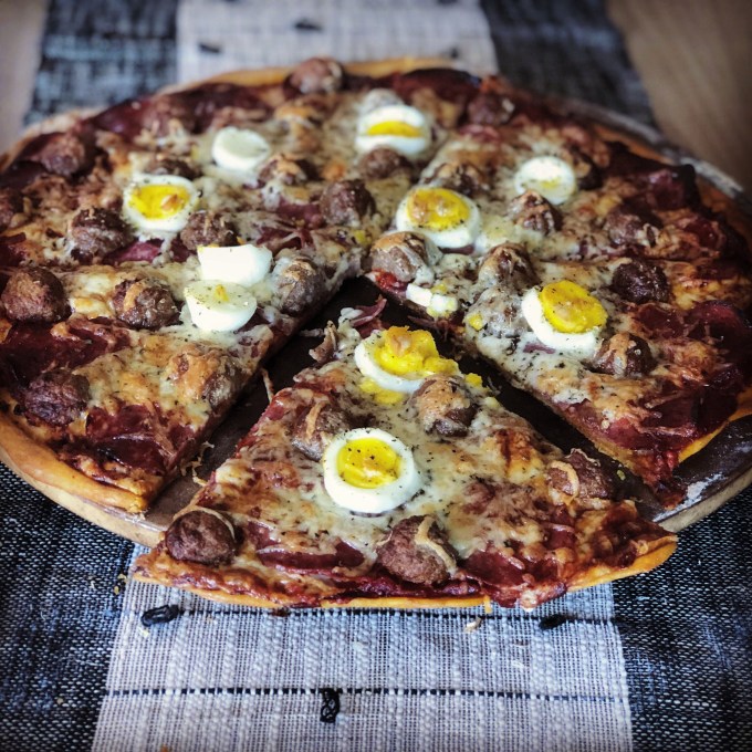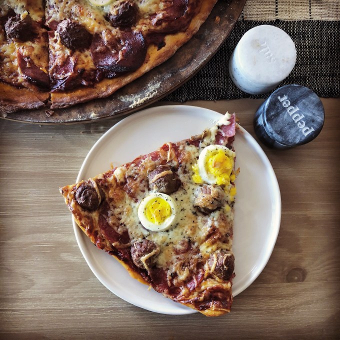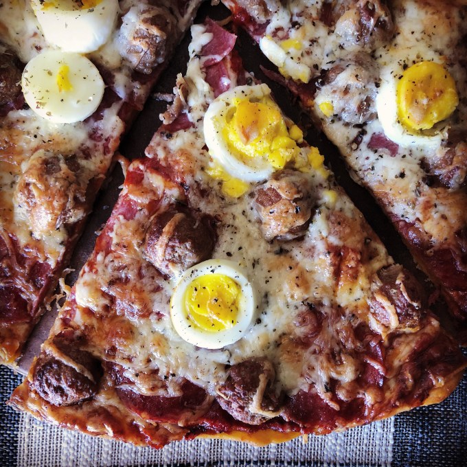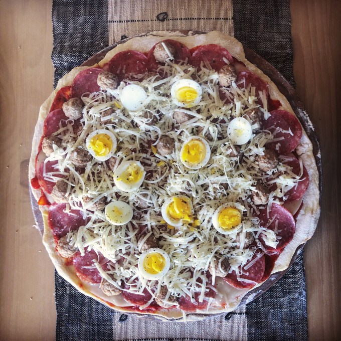 - 2 to 4 hardboiled eggs (I would say “optional” but then this would just be a salami and pepperoni pizza)