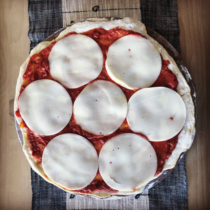 I went back and forth between adding hardboiled eggs on top and raw eggs just before cooking. My preference would have been the raw egg. I went with the hardboiled egg slices because that’s what’s in a Timpano and because I didn’t really want this to be a breakfast-y pizza with runny egg yolk.