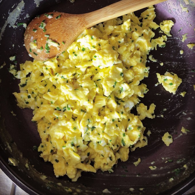 Luckily I had a huge container of Costco eggs in my fridge and some yummy Sabatino’s Chicken Apple Sausages (also from Costco–sorry these are a SoCal specialty) in my freezer. When I asked my guests what kind of eggs they wanted to eat I was met with shrugs until one suggested scrambled eggs. Since I never make scrambled eggs, I looked up a recipe for scrambled eggs with chives (had them in the fridge) and found a dreamy looking recipe at Saveur, which I decided to try. I made some slight modifications.