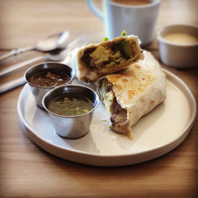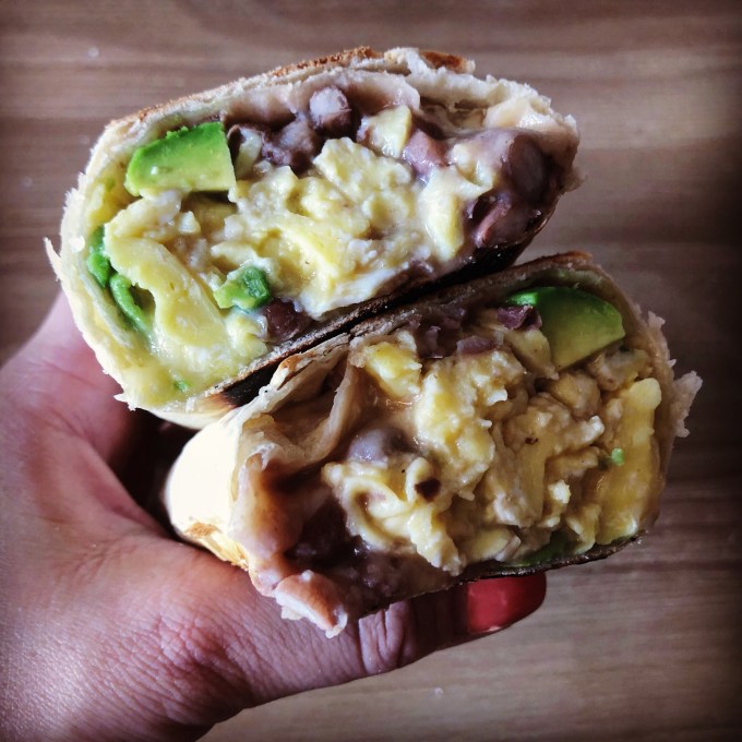 I had recently made some delicious soft-scrambled eggs and decided to use that recipe for our breakfast burrito. Instead of using chives, we used Serrano pepper. We also took some leftover pinto beans we made from Bean + Rice Bowls and mashed them up and warmed them. Then we just threw in some typical breakfast burrito ingredients (aside from potato) and voila, our vegetarian breakfast burrito sans potato was ready to eat.