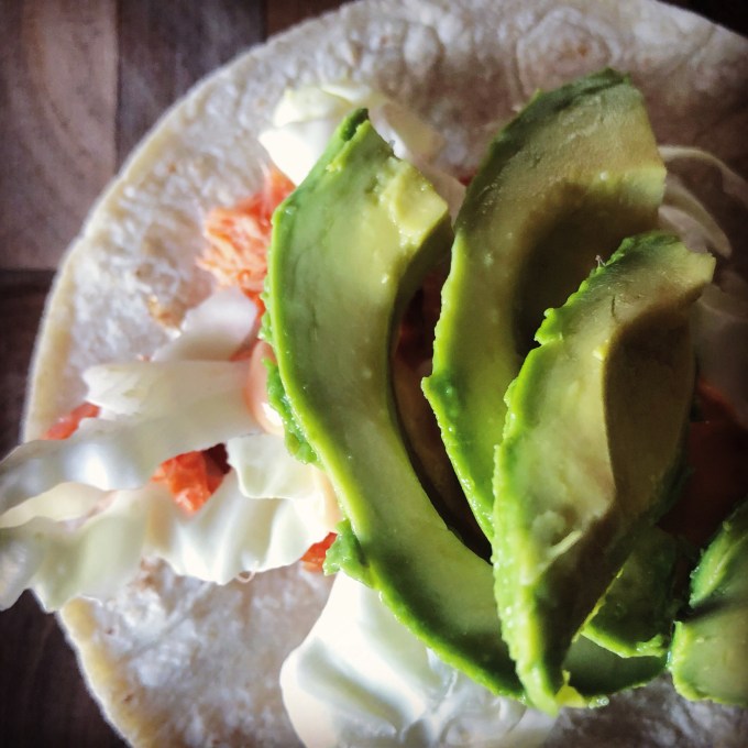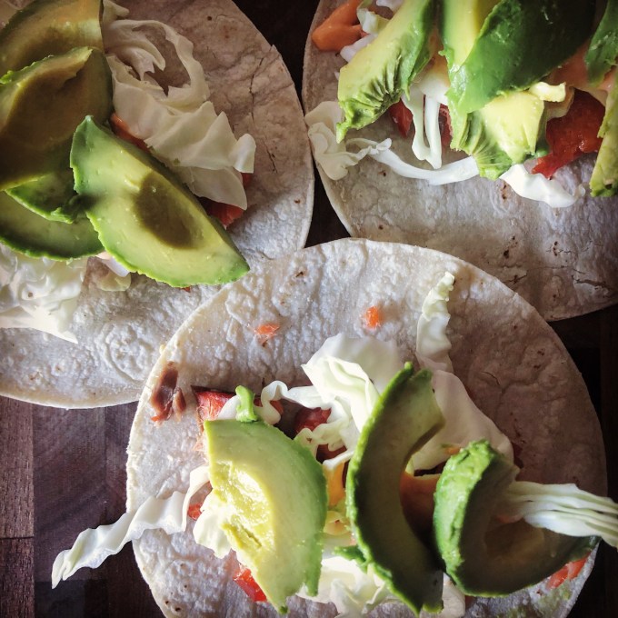 I scouted for some good looking smoked salmon recipes on the internet but ultimately threw together the below recipe based upon ingredients already on hand: smoked salmon (home-smoked by my friend Jen!), corn tortillas, shredded cabbage, avocado and some harissa mayo. Looking back, this is nearly an exact replica of my fresh salmon tacos recipe which only differs by adding cilantro. Incidentally, I’d have thrown some fresh chopped cilantro on top had I had any.