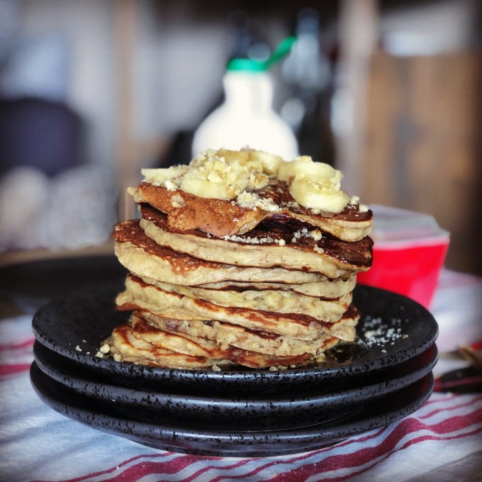 My dad loves pancakes too. When he visits he likes to have pancakes at least once but I think he and I could eat them multiple times throughout his visit. On a short weekend when he was in town, I decided to make some pancakes to use up a massive amount of severely overripe bananas I had sitting on my counter.