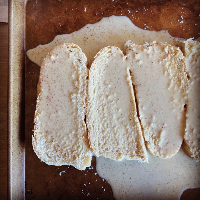 - Place the bread in a shallow dish or pan. Pour the mixture over the bread, then flip the bread over to make sure both sides are evenly coated.