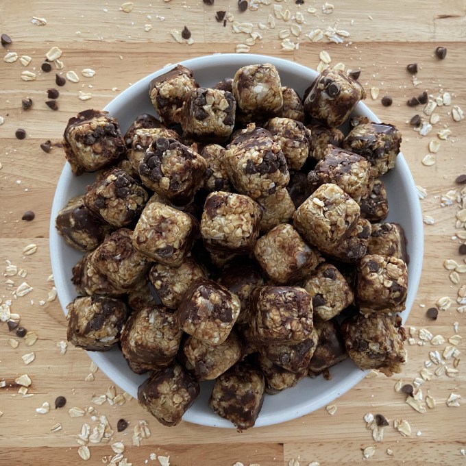 - Use three ice cube trays to make individual square servings. These are the ice cube trays I used. Drop 3 to 4 mini chips in the bottom of each ice cube mold and then press a bit of mixture into each individual ice cube mold. Add enough mixture so that when you press down very hard, the mixture is even with the top of the tray.