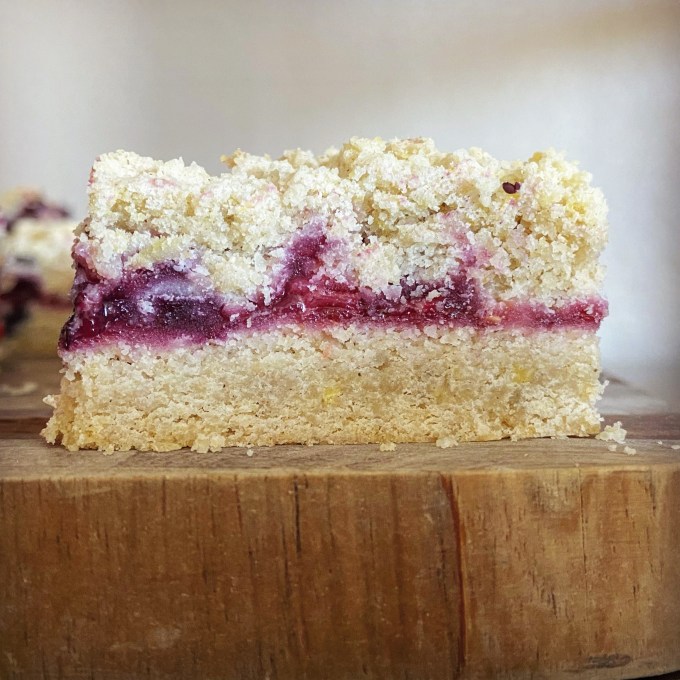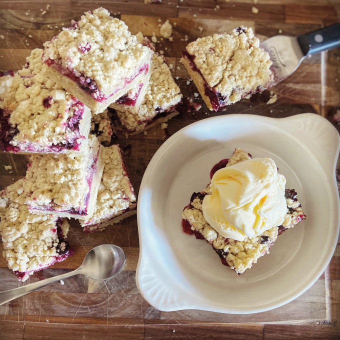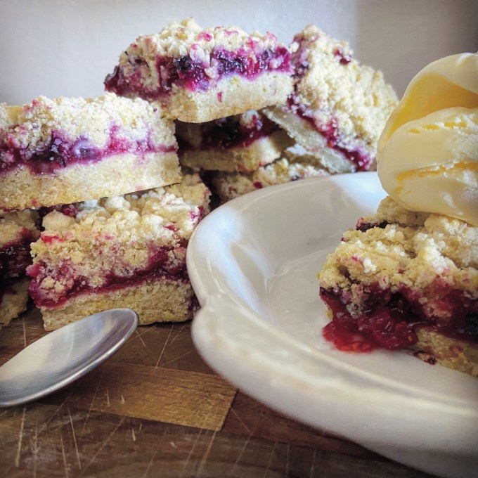 My berries were slightly tart so these bars turned out slightly tart. While the bars are great on their own, they are down-right addicting when you top them with some vanilla ice cream. Heat them up a bit first so that the ice cream starts to melt a bit on the warm crumble topping.