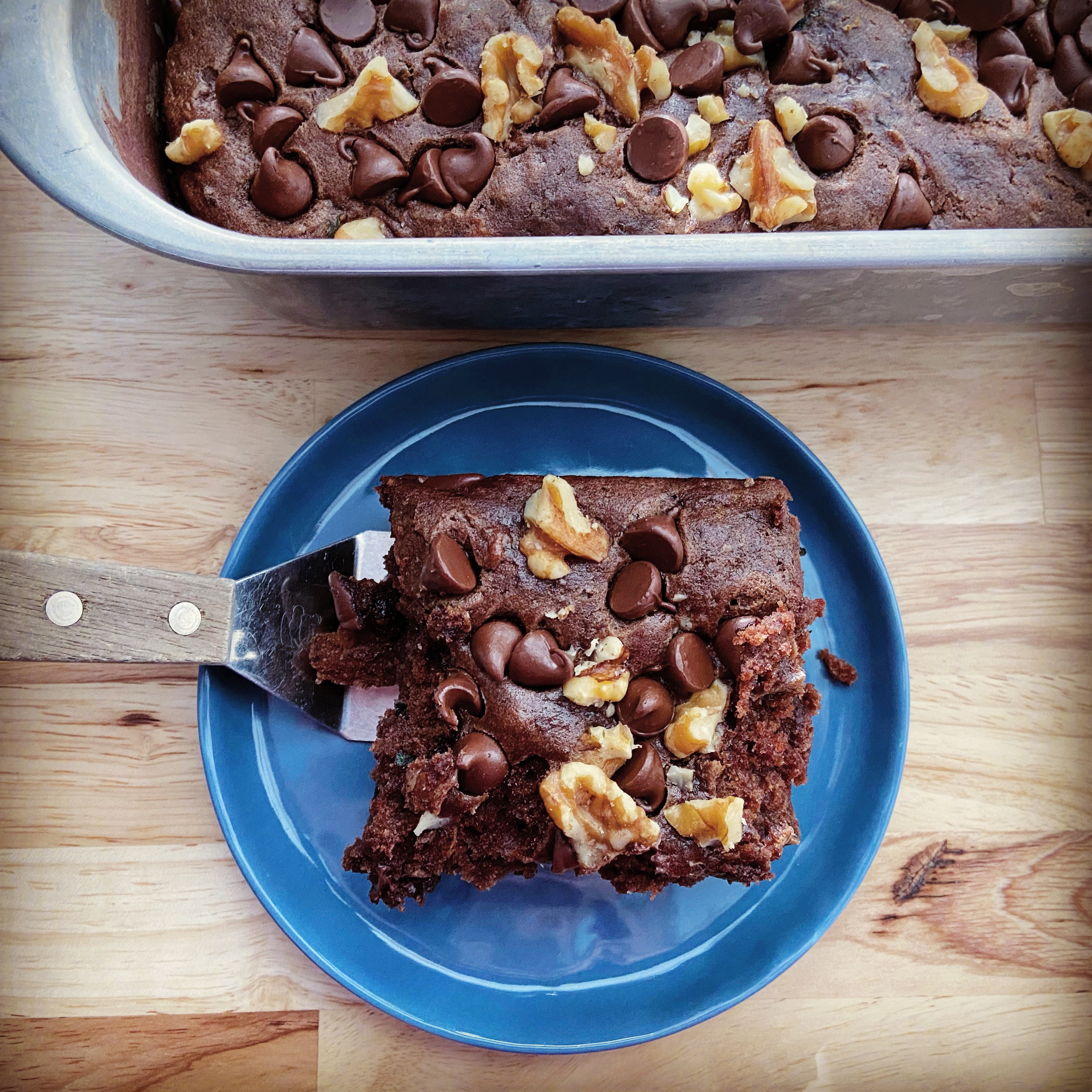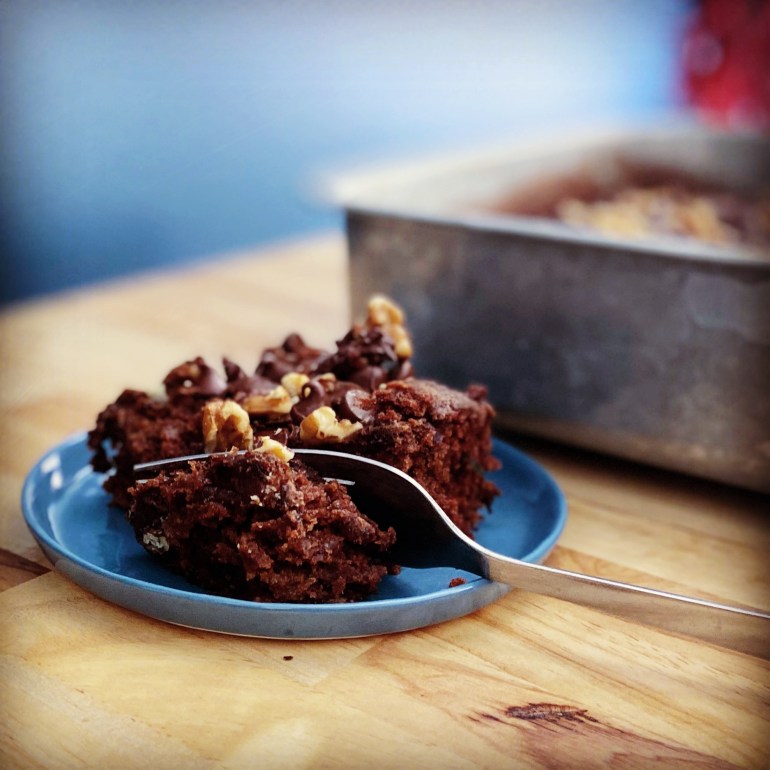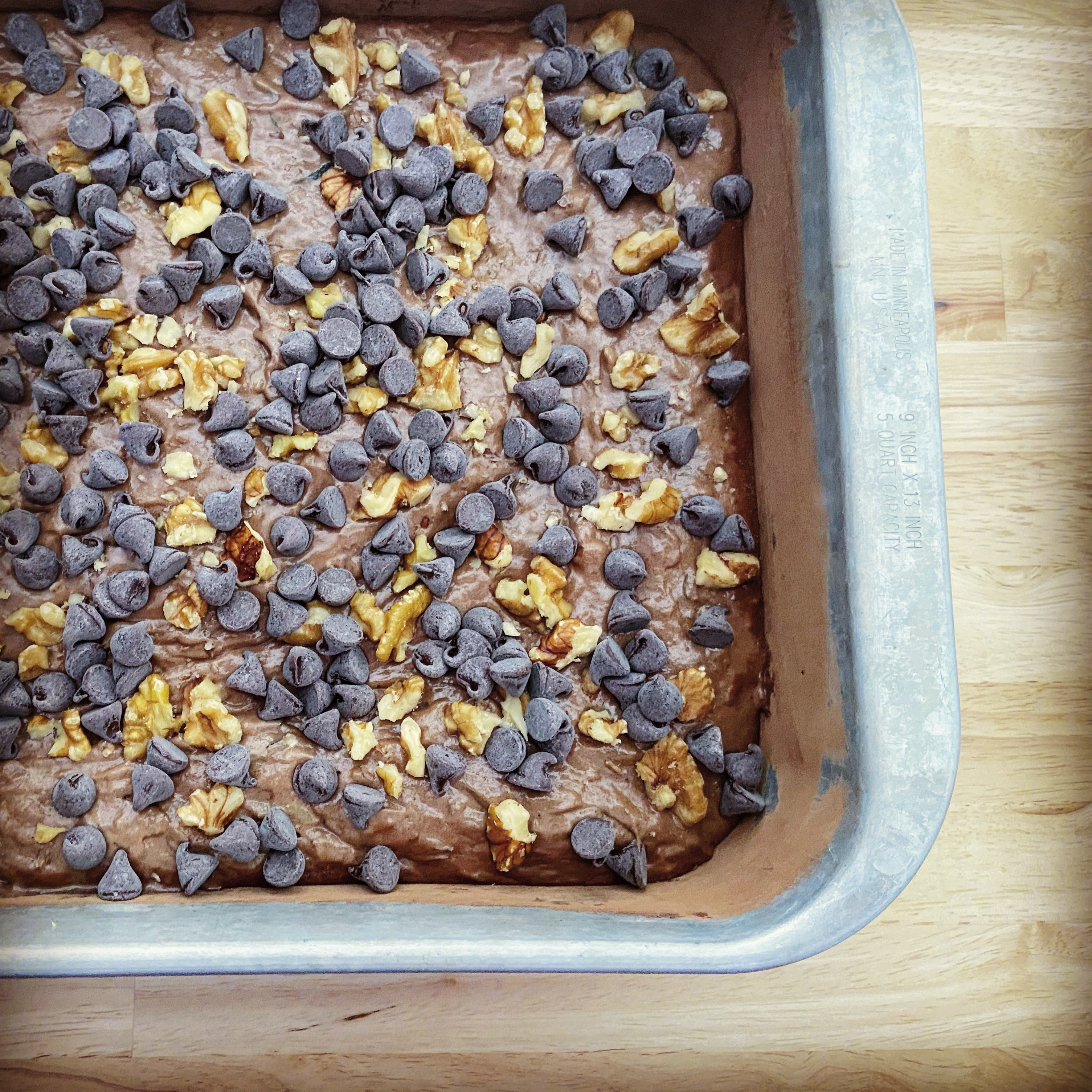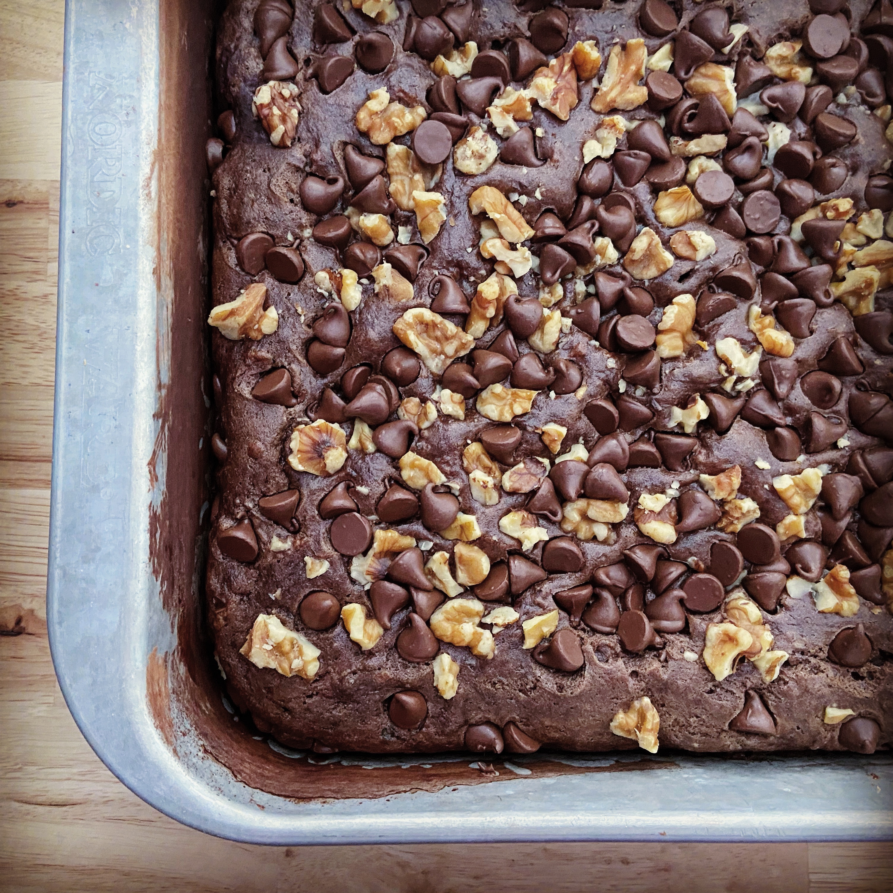 - Pour in 9 x 11 pan greased and floured with additional cocoa powder. Sprinkle chocolate chips and nuts evenly over top of cake.