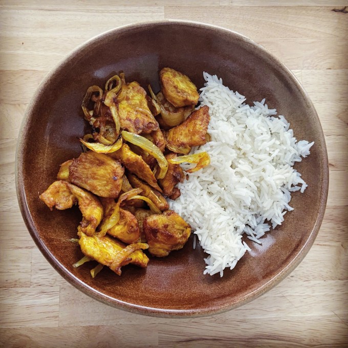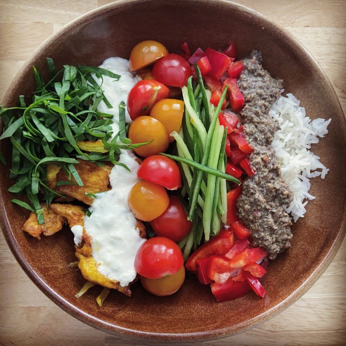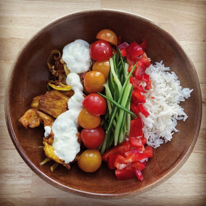 While I intended to make my bowl a duplicate of Suzy’s, Sis decided she wanted to make some Basmati rice. So last minute I decided to convert my bowl to a Chicken Shawarma Rice Bowl with veggies and Tzatziki Sauce.