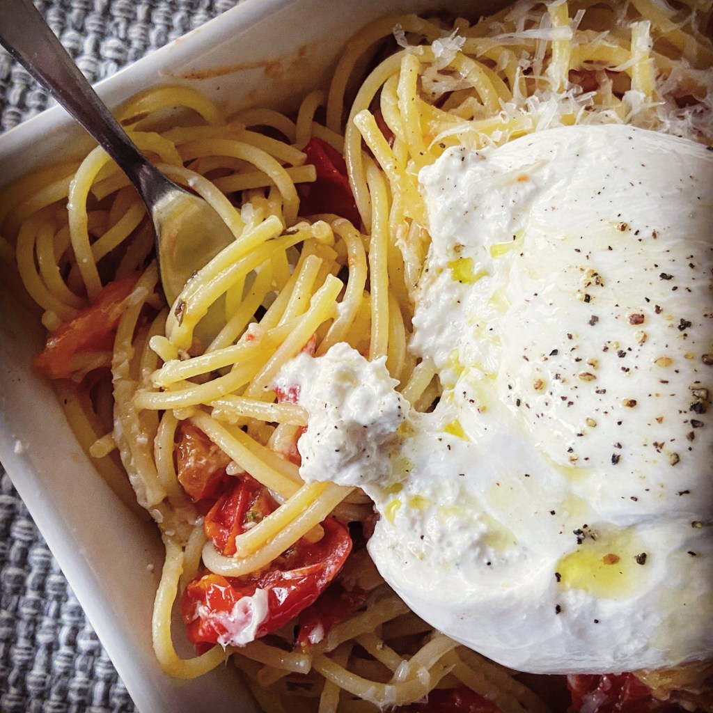 With some burrata cheese calling to me from the fridge, begging me to use it, I had to find a recipe worth consumption. I figured pasta was the obvious choice (aside from the standard tomato, basil and burrata salad that you can find anywhere) and perused a bunch of tomato, burrata and pasta recipes before landing on one that looked easily replicable. Only I didn’t have the 4 cups of tomatoes required for that recipe so I gave up and decided to kinda just do my own thing.