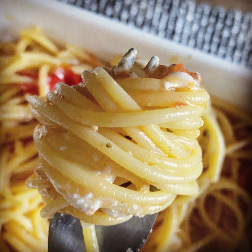 - 12 oz box of gluten-free spaghetti, linguine or fettucine, cooked al dente, pasta water reserved (can use non-gluten-free pasta)