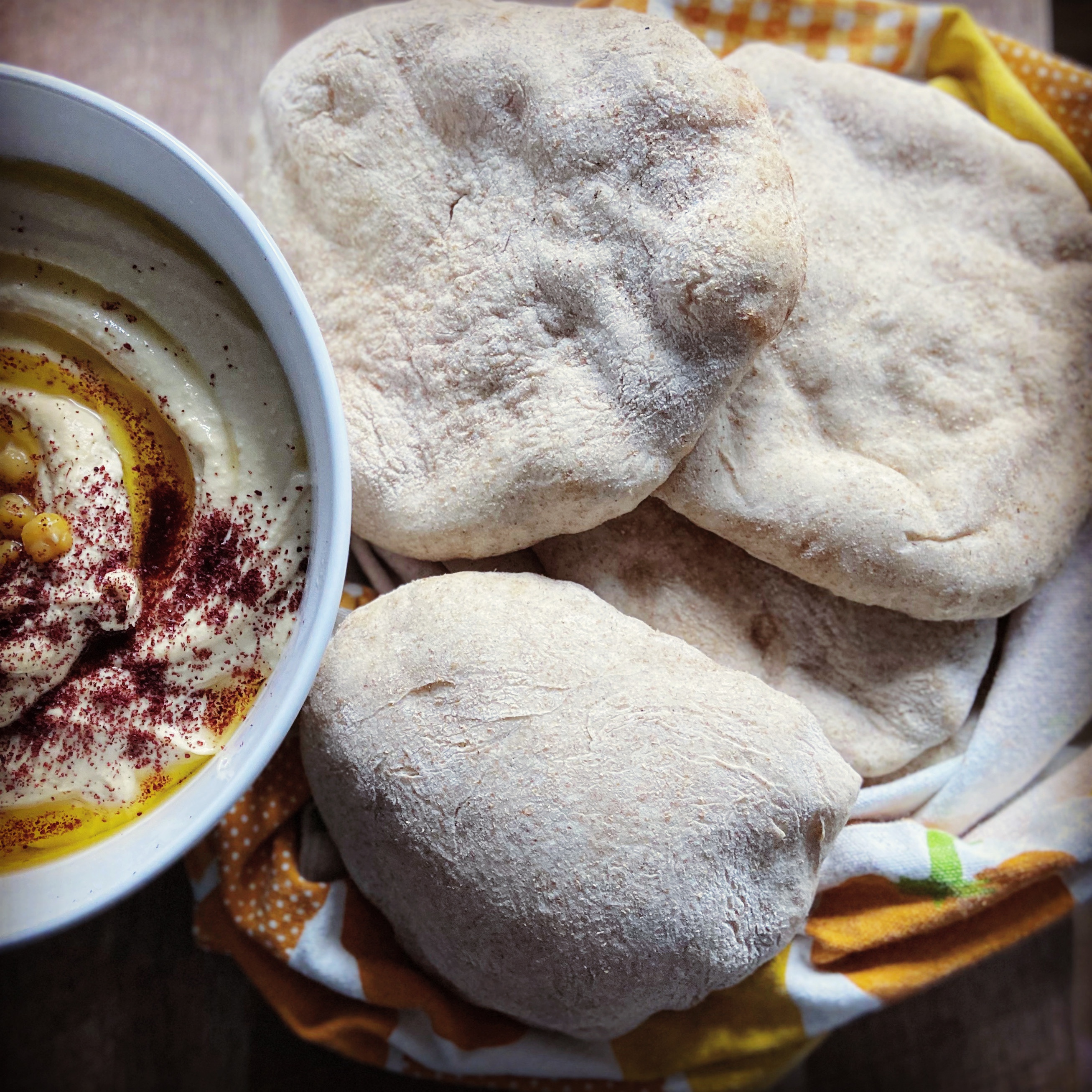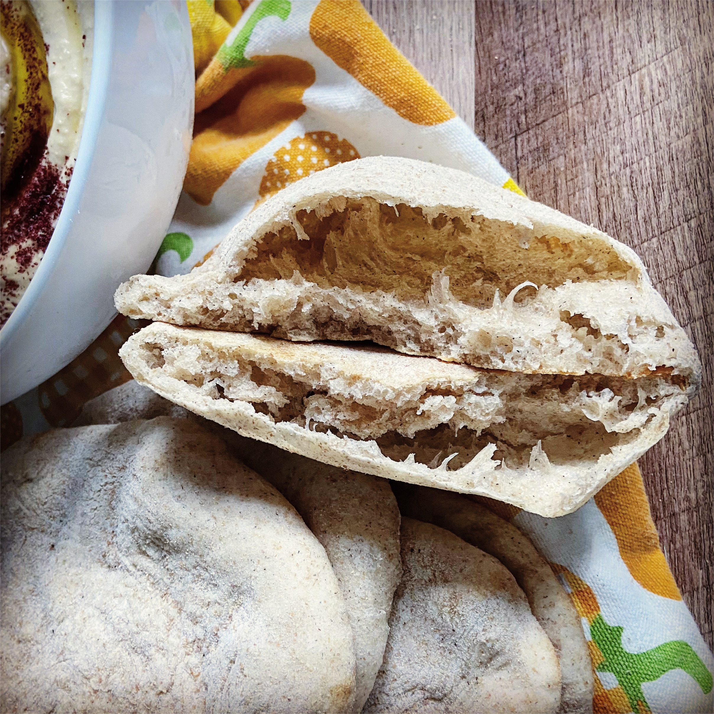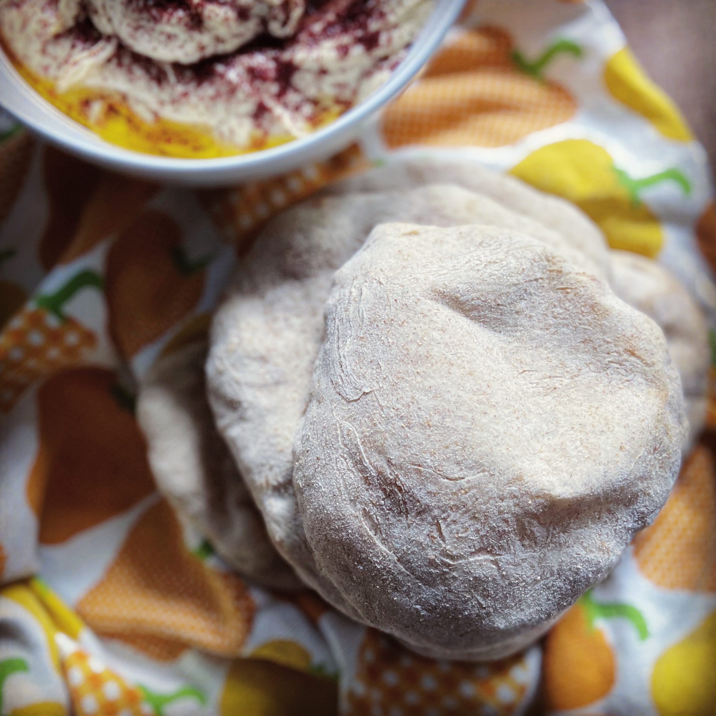 Sis always has sourdough starter in her fridge, so one day I suggested to her that we should try making sourdough pita. I love having pita on hand to eat with hummus. She fed her starter and handed it over to me and told me to go for it. She’s had trouble successfully making pita in the past — something about the pita not rising.