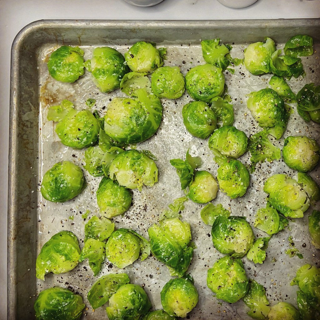 It turns out the full body Brussels sprout workout was worth it. Between the three of us, Dad, Sis and I polished off the entire two-pound bag of Brussels sprouts. Sis said they were probably the best Brussels sprouts she ever had. Because you flatten them, there is more surface area hitting the pan and you achieve the ultimate crispiness.