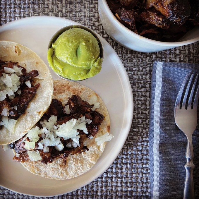 - When you’re ready to make yourself some tacos, put the meat until a small saucepan and add the reserved sauce. (The grease/fat had solidified at the top and I pulled that off and threw it out.) Re-heat, covered, over medium-low heat. Once warm, serve with minced onions on top of some warm corn tortillas.