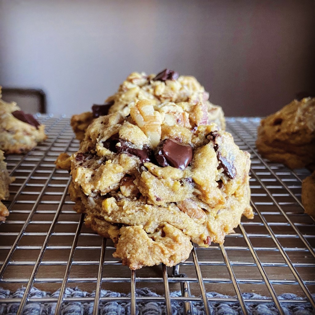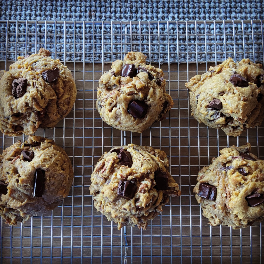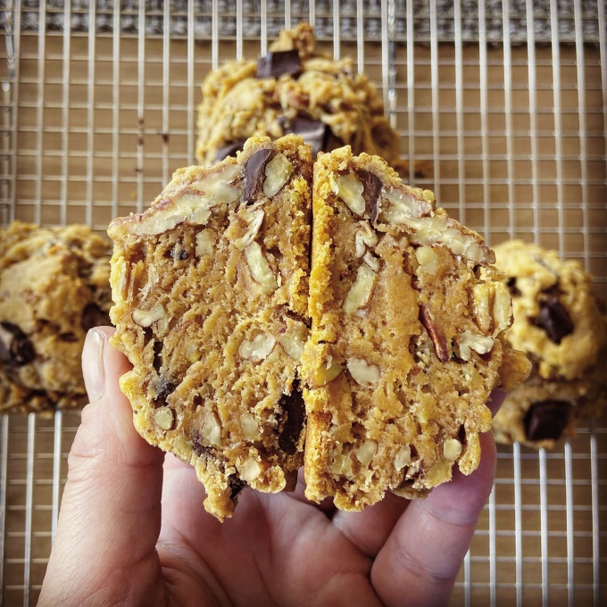 My mind wandered to making something with pumpkin and chocolate chunks and settled on cookies. Particularly, I wanted to make some Levain-style cookies because they’re basically my favorite cookie of all time. So I googled whether or not someone had the idea before me and turns out someone had: Brooklynn at A Pleasant Palate.
