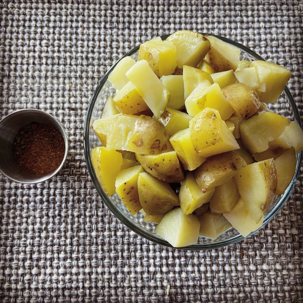 That something was to turn them into breakfast potatoes so I could eat them with eggs. I found a great recipe at Little Spice Jar. My recipe is a gentle adaptation of Marzia’s recipe.